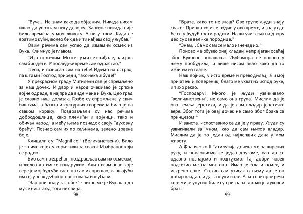 А Франческо II Гатилузија дочека ме раширених руку , и поклонисмо се један другоме , као да се одавно познајемо и поштујемо . Тај добри човек подсетио ме на мог оца . Имао је благи осмех , и искрено срце . Стекао сам утисак о њему да је он добар владар , и да га људи воле . А његове прве речи које ми је упутио биле су признање да ми је духовни брат .