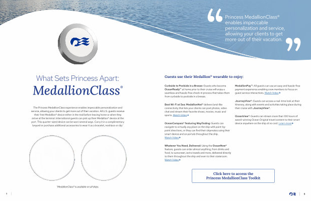 The Princess MedallionClass experience enables impeccable personalization and service , allowing your clients to get more out of their vacation . All U . S . guests receive their free Medallion ® device either in the mail before leaving home or when they arrive at the terminal . International guests can pick up their Medallion ® device at the port . This quarter-sized device can be worn several ways . Carry it in a complimentary lanyard or purchase additional accessories to wear it as a bracelet , necklace or clip . *