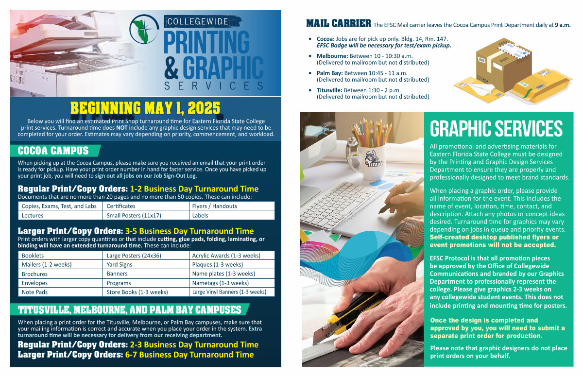 All promotional and advertising materials for Eastern Florida State College must be designed by the Printing and Graphic Design Services Department to ensure they are properly and professionally designed to meet brand standards.