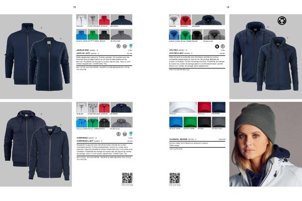 Veste zippée sans capuche . Poches cachées . Col montant pour les hommes avec protège menton et col à bord-côtes plats pour les femmes . Possibilité de changer la couleur des tire-zips . Ceux-ci sont vendus séparément . Certifié Oeko-Tex .
