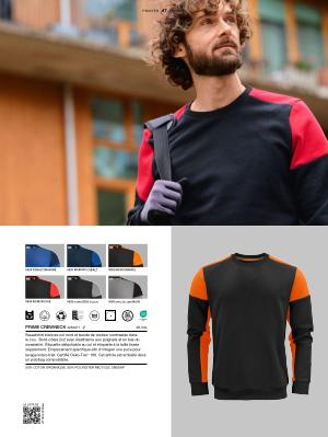 Sweatshirt bicolore col rond et bande de couleur contrastée dans le cou . Bord-côtes 2x2 avec élasthanne aux poignets et en bas du sweatshirt . Étiquette détachable au col et étiquette à la taille tissée séparément . Emplacement spécifique afin d ’ intégrer une puce pour lavage indus-triel . Certifié Oeko-Tex ® 100 . Cet article est emballé dans un polybag compostable .