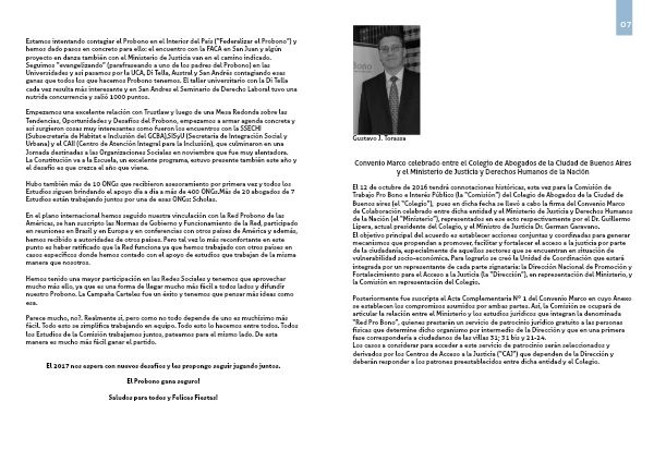 El 12 de octubre de 2016 tendrá connotaciones históricas, esta vez para la Comisión de Trabajo Pro Bono e Interés Público (la “Comisión”) del Colegio de Abogados de la Ciudad de Buenos aires (el “Colegio”), pues en dicha fecha se llevó a cabo la firma del Convenio Marco de Colaboración celebrado entre dicha entidad y el Ministerio de Justicia y Derechos Humanos de la Nación (el “Ministerio”), representados en ese acto respectivamente por el Dr. Guillermo Lipera, actual presidente del Colegio, y el Ministro de Justicia Dr. German Garavano.