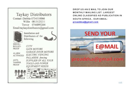 DROP US AN E MAIL TO JOIN OUR MONTHLY MAILING LIST. LARGEST ONLINE CLASSIFIED AD PUBLICATION IN SOUTH AFRICA.. OUR EMAIL: proaddsa @ gmail. com
