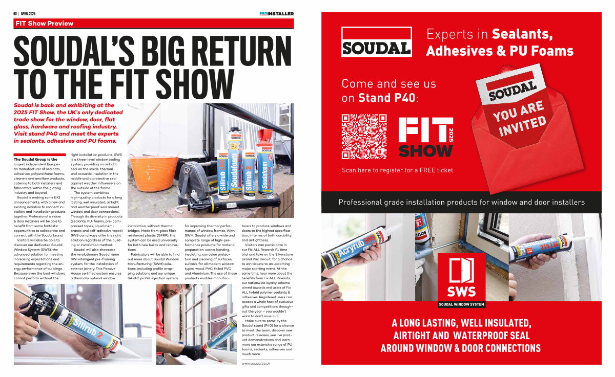 The Soudal Group is the largest independent European manufacturer of sealants, adhesives, polyurethane foams, cleaners and ancillary products, catering to both installers and fabricators within the glazing industry and beyond.