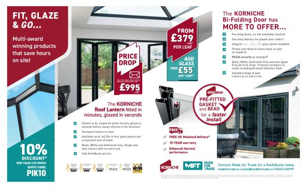 * Discount applies to all trade customers and applied to the first , single item purchase only of Korniche product | Uni-blind glass delivered separately | PAS24 as standard requires laminated glass installation | Door price based on a Trade RRP for a 5-5-0 configuration 3500 x 2000 , stock colour , unglazed . Volume discounts available . Door and Glass prices include delivery , postcode restrictions apply | Lantern price based on a standard range anthracite grey on white , 2m x 1m roof lantern . Single drop – Both product and glass on the same delivery | Prices are correct at point of publishing and may be subject to change | Delivery restrictions apply .