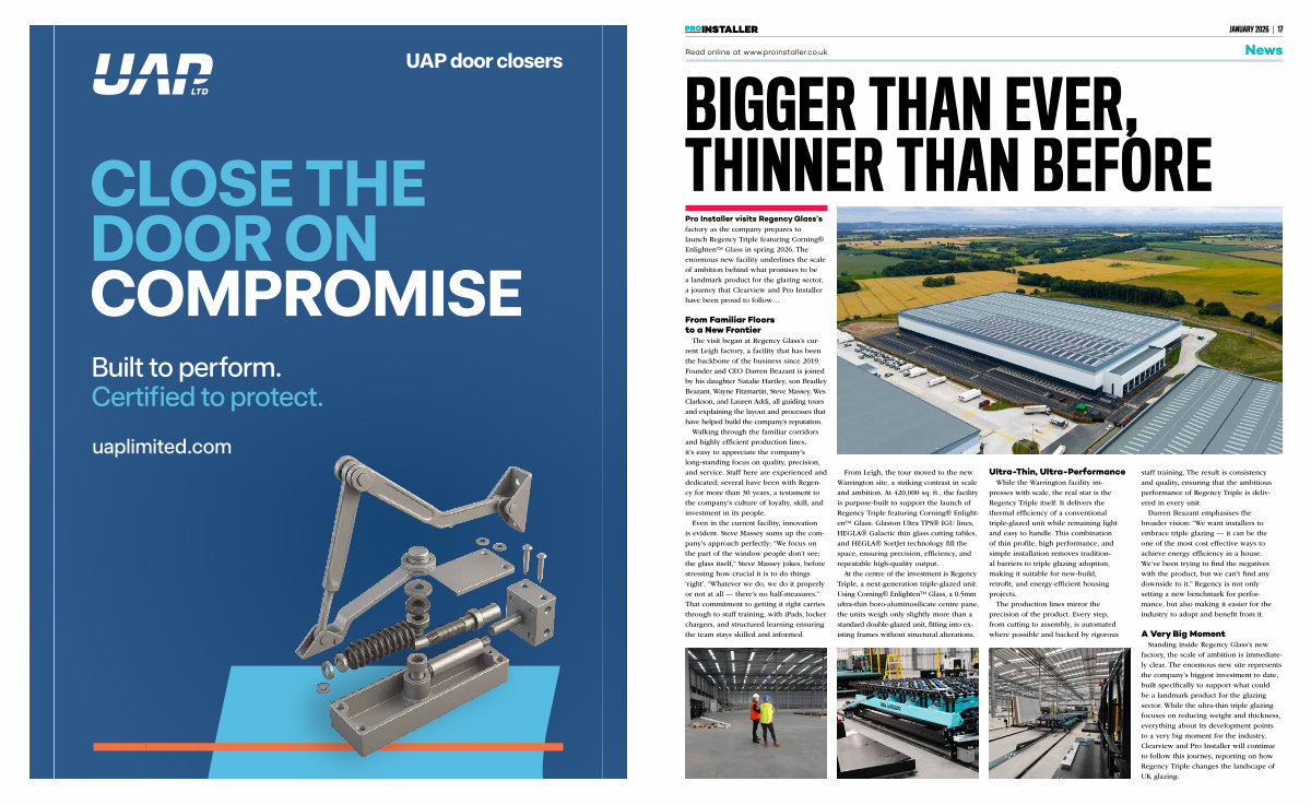 Standing inside Regency Glass’ s new factory, the scale of ambition is immediately clear. The enormous new site represents the company’ s biggest investment to date, built specifically to support what could be a landmark product for the glazing sector. While the ultra-thin triple glazing focuses on reducing weight and thickness, everything about its development points to a very big moment for the industry. Clearview and Pro Installer will continue to follow this journey, reporting on how Regency Triple changes the landscape of UK glazing.