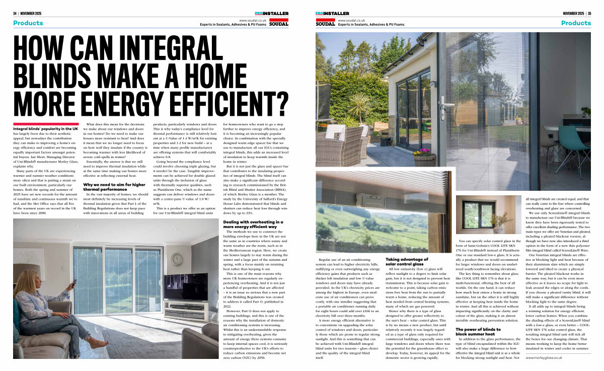 Integral blinds’ popularity in the UK has largely been due to their aesthetic appeal, but nowadays the contribution they can make to improving a home’ s energy efficiency and comfort are becoming equally important factors amongst potential buyers. Ian Short, Managing Director of Uni-Blinds ® manufacturer Morley Glass, explains why.