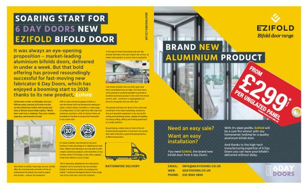 It was always an eye-opening proposition – market-leading aluminium bifolds doors , delivered in under a week . But that bold offering has proved resoundingly successful for fast-moving new fabricator 6 Day Doors , which has enjoyed a booming start to 2020 thanks to its new product , Ezifold .
