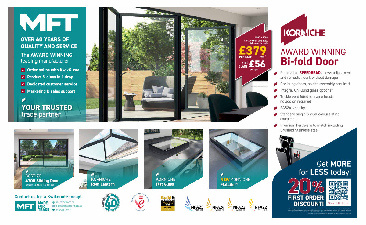 * Discount applies to all new trade customers and is applied to the first, single item purchase of a Korniche product or Cortizo 4700 Sliding Door | Uni-blind glass delivered separately | Door price based on a Trade RRP for a 5-5-0 configuration 4500 x 2000, stock colour, unglazed | PAS: 24, only when fitted with laminated glass classified under BS EN 356:2000 Class P1A | Cannot be used in conjunction with any other offer or discounts. Prices are correct at point of publishing and may be subject to change | Delivery restrictions apply.