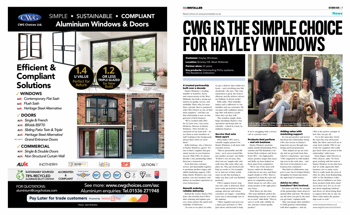 Kelly Easthope, also a Director at Hayley Windows, agrees:“ It’ s rare to find a supplier that genuinely invests in your business success. With CWG, it’ s always felt like a true partnership rather than just a transaction.”