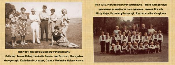 Rok 1982. Pierwszaki z wychowawczynią – Marią Grzegorczyk (pierwsza z prawej) oraz nauczycielami: Joanną Śmiech, Alicją Major, Kazimierą Prusaczyk, Ryszardem Barańczykiem.