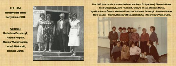 Rok 1984. Nauczyciele przed budynkiem GOK. Od lewej: Kazimiera Prusaczyk, Regina Filipiak, Marian Wychowaniec, Leszek Piekarski, Barbara Jurek.