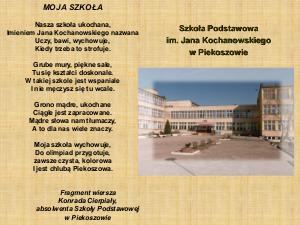 MOJA SZKOŁA Nasza szkoła ukochana, Imieniem Jana Kochanowskiego nazwana Uczy, bawi, wychowuje, Kiedy trzeba to strofuje. Grube mury, piękne sale, Tu się kształci doskonale. W takiej szkole jest wspaniale I nie męczysz się tu wcale. Grono mądre, ukochane Ciągle jest zapracowane. Mądre słowa nam tłumaczy, A to dla nas wiele znaczy. Moja szkoła wychowuje, Do olimpiad przygotuje, zawsze czysta, kolorowa I jest chlubą Piekoszowa. Fragment wiersza Konrada Cierpiały, absolwenta Szkoły Podstawowej w Piekoszowie Szkoła Podstawowa im. Jana Kochanowskiego w Piekoszowie