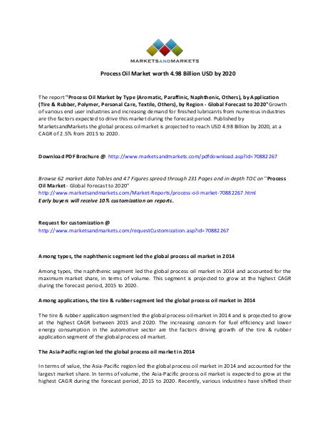 MarketsandMarkets the global process oil market is projected to reach USD 4.98 Billion by 2020, at a