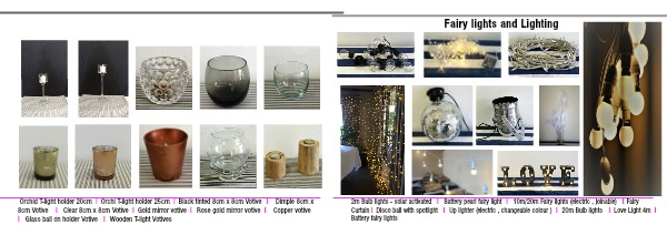 Orchid T-light holder 20cm l Orchi T-light holder 25cm l Black tinted 8cm x 8cm Votive I Dimple 8cm x 8cm Votive I Clear 8cm x 8cm Votive I Gold mirror votive l Rose gold mirror votive l Copper votive I Glass ball on holder Votive I Wooden T-light Votives