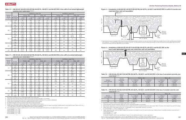Table 18 — Hilti KH-EZ , KH-EZ P , KH-EZ PM , KH-EZ PL , KH-EZ C and KH-EZ CRC in the top of uncracked concrete over metal deck 1 , 2 , 3 , 4 , 5