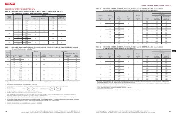 Table 32 — Hilti KH-EZ , KH-EZ P , KH-EZ PM , KH-EZ PL , KH-EZ C and KH-EZ CRC allowable loads installed in top-of-grout-filled concrete masonry walls or horizontal members of wall openings 1 , 2 , 3