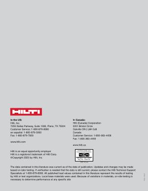 The data contained in this literature was current as of the date of publication . Updates and changes may be made based on later testing . If verification is needed that the data is still current , please contact the Hilti Technical Support Specialists at 1-800-879-8000 . All published load values contained in this literature represent the results of testing by Hilti or test organizations . Local base materials were used . Because of variations in materials , on-site testing is necessary to determine performance at any specific site .