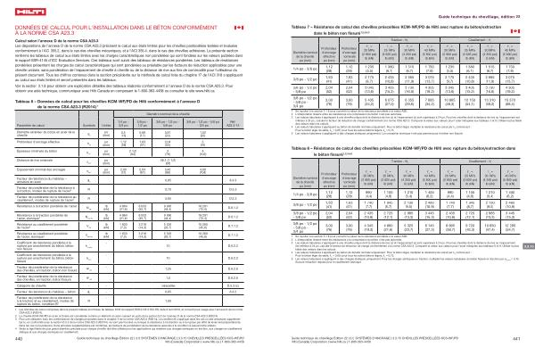 Tableau 7 – Résistance de calcul des chevilles préscellées KCM-WF / PD de Hilti avec rupture du béton / extraction dans le béton non fissuré 1 , 2 , 3 , 4 , 5