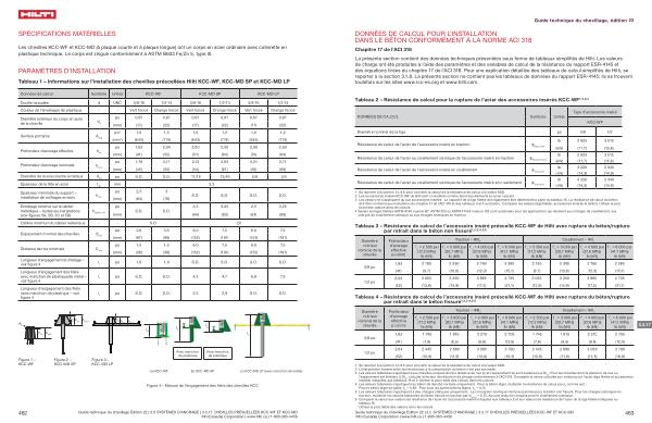 La présente section contient des données techniques présentées sous forme de tableaux simplifiés de Hilti . Les valeurs de charge ont été produites à l ’ aide des paramètres et des variables de calcul de la résistance du rapport ESR-4145 et des équations tirées du chapitre 17 de l ’ ACI 318 . Pour une explication détaillée des tableaux de calcul simplifiés de Hilti , se reporter à la section 3.1.8 . La présente section ne contient pas les tableaux de données du rapport ESR-4145 ; ils se trouvent toutefois sur les sites www . icc-es . org et www . hilti . com .