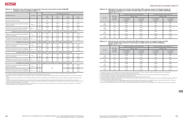 1 Se reporter à la section 3.1.8.6 du Guide technique des produits de Hilti , édition 2019 ( GTP , éd . 19 ) pour convertir la valeur de la résistance de calcul à la valeur ASD . 2 Les accessoires insérés KCC-MD de Hilti sont considérés comme étant des éléments en acier cassant . 3 Les valeurs de traction ne s ’ appliquent qu ’ aux accessoires insérés . La capacité des tiges filetées doit également être déterminée à partir du tableau 16 . La résistance de calcul du béton doit être obtenue à partir des tableaux 10 à 15 . Comparer les valeurs de traction de la tige filetée , des accessoires insérés et du béton . Utiliser la plus faible des valeurs dans les calculs .