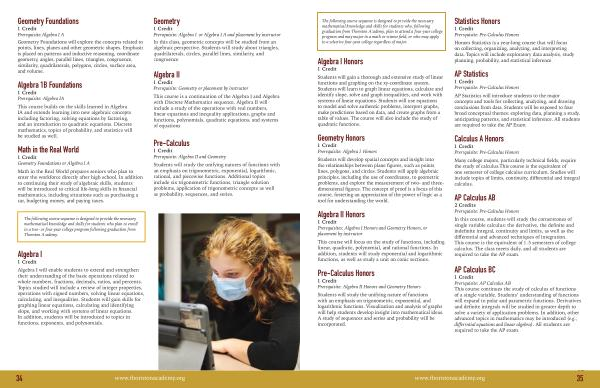 The following course sequence is designed to provide the necessary mathematical knowledge and skills for students who plan to enroll in a two- or four-year college program following graduation from Thornton Academy .