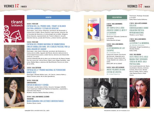 Participan : José Javier Villarreal , secretario de Extensión y Cultura de la UANL ; Agustín del Moral , director editorial de la Universidad Veracruzana ; Lizbet García , directora de Desarrollo Cultural ; y el autor . Lectura dramatizada de la obra con la dirección de Mayra Vargas . Con las voces de : Leticia Parra , Pablo Luna , Edgar Garduño , Juan Luna , Debby Báez y alumnos del Bachillerato Técnico en Artes de la UANL .