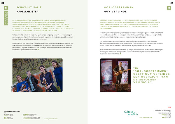 In‘ Oorlogsstemmen’ geeft Guy Verlinde een overzicht van de gevolgen van WO I, aan de hand van anekdotes, gedichten en oorlogsliederen. Hij legt de link naar vandaag en bespreekt de uitdagingen en bedreigingen waar we als samenleving mee kampen.