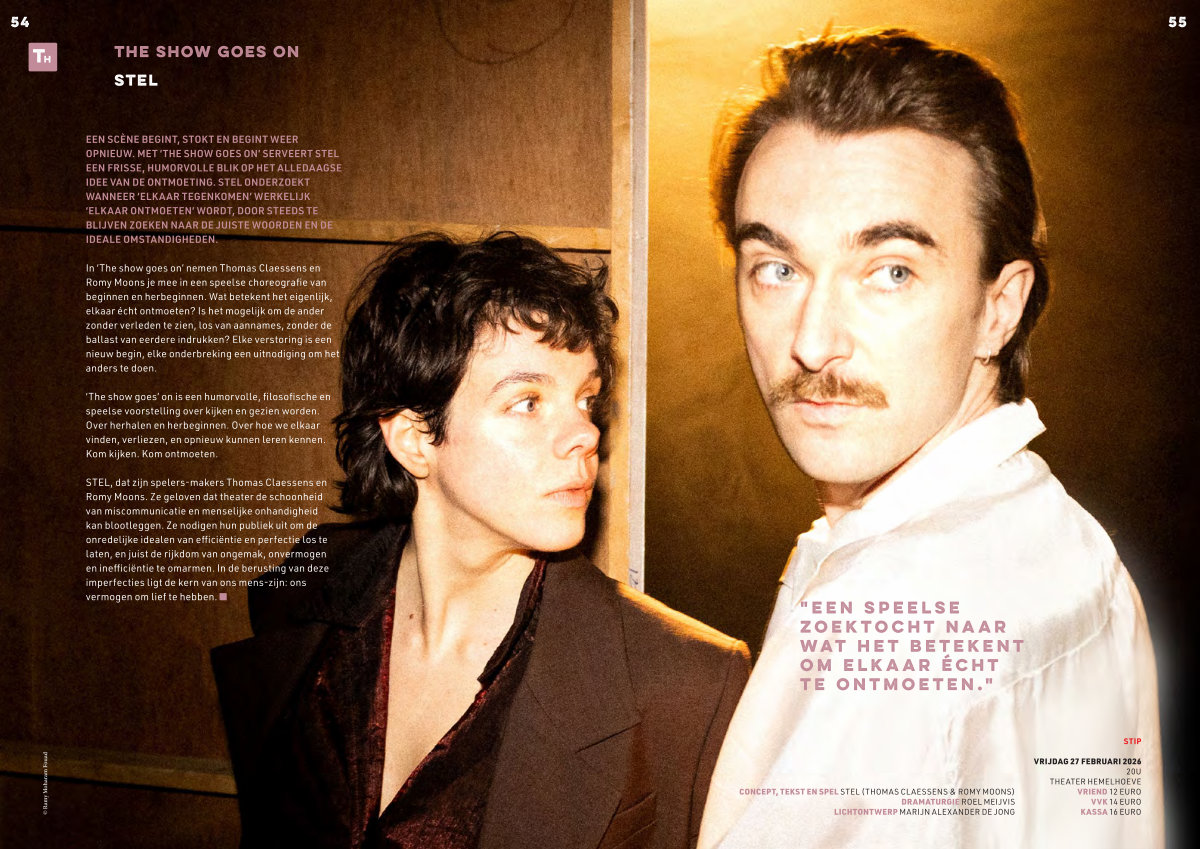 EEN SCÈNE BEGINT, STOKT EN BEGINT WEER OPNIEUW. MET‘ THE SHOW GOES ON’ SERVEERT STEL EEN FRISSE, HUMORVOLLE BLIK OP HET ALLEDAAGSE IDEE VAN DE ONTMOETING. STEL ONDERZOEKT WANNEER‘ ELKAAR TEGENKOMEN’ WERKELIJK‘ ELKAAR ONTMOETEN’ WORDT, DOOR STEEDS TE BLIJVEN ZOEKEN NAAR DE JUISTE WOORDEN EN DE IDEALE OMSTANDIGHEDEN.