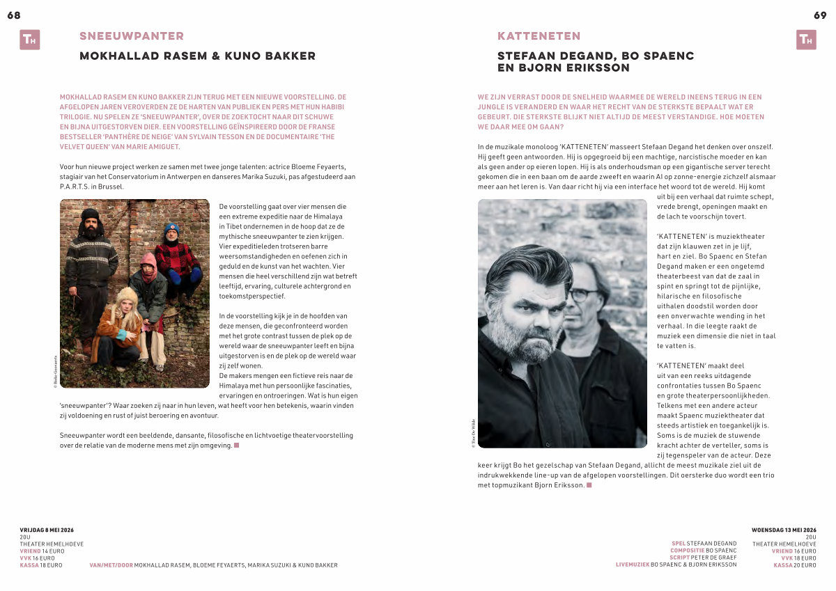 MOKHALLAD RASEM EN KUNO BAKKER ZIJN TERUG MET EEN NIEUWE VOORSTELLING. DE AFGELOPEN JAREN VEROVERDEN ZE DE HARTEN VAN PUBLIEK EN PERS MET HUN HABIBI TRILOGIE. NU SPELEN ZE‘ SNEEUWPANTER’, OVER DE ZOEKTOCHT NAAR DIT SCHUWE EN BIJNA UITGESTORVEN DIER. EEN VOORSTELLING GEÏNSPIREERD DOOR DE FRANSE BESTSELLER‘ PANTHÈRE DE NEIGE’ VAN SYLVAIN TESSON EN DE DOCUMENTAIRE‘ THE VELVET QUEEN’ VAN MARIE AMIGUET.