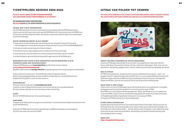 Koop je VRIENDenpas vanaf woensdag 28 mei om 9u online via onze website www. cultuurcentrumbrasschaat. be. Op p82 en p83 vind je een handige checklist terug waarop je je online inschrijving kan voorbereiden!