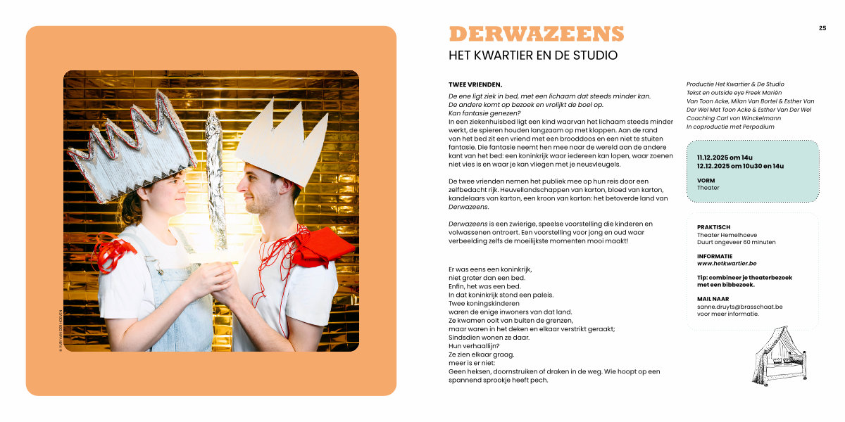 Derwazeens is een zwierige, speelse voorstelling die kinderen en volwassenen ontroert. Een voorstelling voor jong en oud waar verbeelding zelfs de moeilijkste momenten mooi maakt!