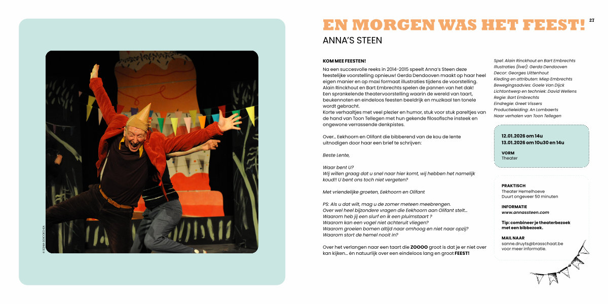 Na een succesvolle reeks in 2014-2015 speelt Anna’ s Steen deze feestelijke voorstelling opnieuw! Gerda Dendooven maakt op haar heel eigen manier en op maxi formaat illustraties tijdens de voorstelling. Alain Rinckhout en Bart Embrechts spelen de pannen van het dak! Een sprankelende theatervoorstelling waarin de wereld van taart, beukennoten en eindeloos feesten beeldrijk en muzikaal ten tonele wordt gebracht. Korte verhaaltjes met veel plezier en humor, stuk voor stuk pareltjes van de hand van Toon Tellegen met hun gekende filosofische insteek en ongewone verrassende denkpistes.