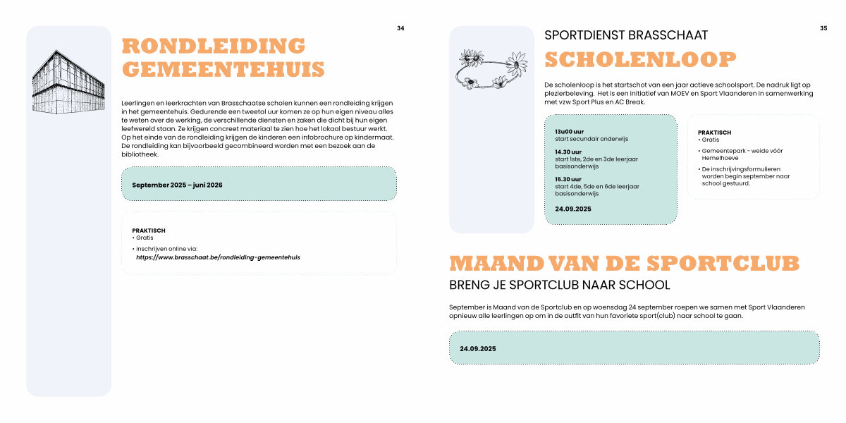 Leerlingen en leerkrachten van Brasschaatse scholen kunnen een rondleiding krijgen in het gemeentehuis. Gedurende een tweetal uur komen ze op hun eigen niveau alles te weten over de werking, de verschillende diensten en zaken die dicht bij hun eigen leefwereld staan. Ze krijgen concreet materiaal te zien hoe het lokaal bestuur werkt. Op het einde van de rondleiding krijgen de kinderen een infobrochure op kindermaat. De rondleiding kan bijvoorbeeld gecombineerd worden met een bezoek aan de bibliotheek.