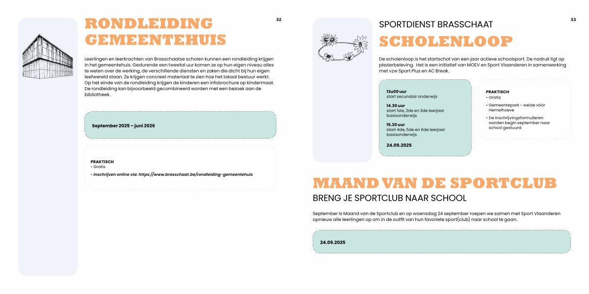 Leerlingen en leerkrachten van Brasschaatse scholen kunnen een rondleiding krijgen in het gemeentehuis. Gedurende een tweetal uur komen ze op hun eigen niveau alles te weten over de werking, de verschillende diensten en zaken die dicht bij hun eigen leefwereld staan. Ze krijgen concreet materiaal te zien hoe het lokaal bestuur werkt. Op het einde van de rondleiding krijgen de kinderen een infobrochure op kindermaat. De rondleiding kan bijvoorbeeld gecombineerd worden met een bezoek aan de bibliotheek.