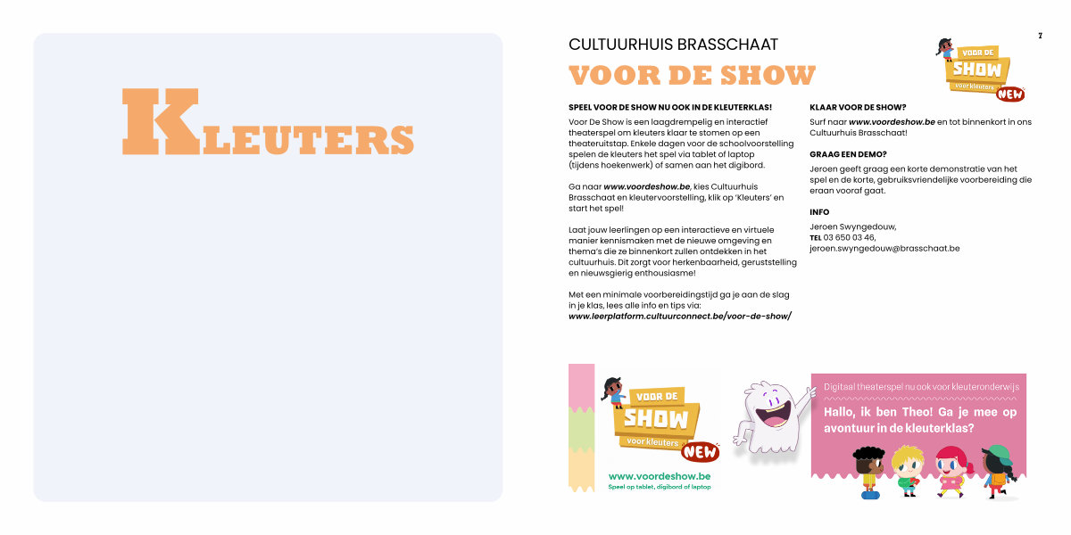 Ga naar www. voordeshow. be, kies Cultuurhuis Brasschaat en kleutervoorstelling, klik op‘ Kleuters’ en start het spel!