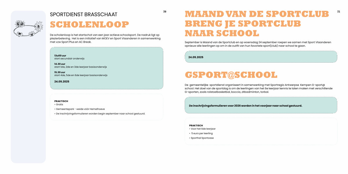 De gemeentelijke sportdienst organiseert in samenwerking met Sportregio Antwerpse Kempen G-sport @ school. Het doel van de sportdag is om de leerlingen van het 6e leerjaar kennis te laten maken met verschillende G-sporten, zoals rolstoelbasketbal, boccia, zitbadminton, torbal.