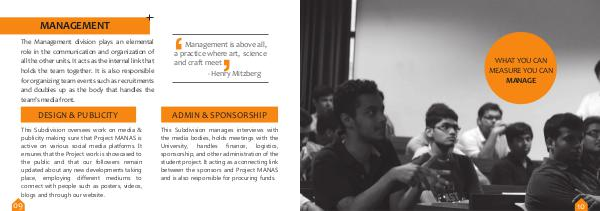 This Subdivision manages interviews with the media bodies, holds meetings with the University, handles finance, logistics, sponsorship, and other administration of the student project. It acting as a connecting link between the sponsors and Project MANAS and is also responsible for procuring funds.