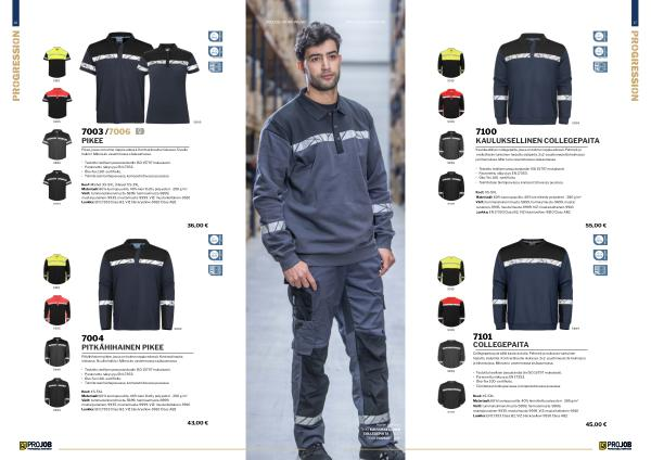 Koot: XS-5XL Materiaali: 60 % luomupuuvilla, 40 % kierrätetty polyesteri- 280 g / m 2 Värit: tummansininen / musta-5899, harmaa / musta-9899, musta / punainen-9935, musta / musta-9999. VIZ: musta / keltainen-9910 Luokka: EN 17353 Class B2, VIZ black / yellow-9910 Class AB2