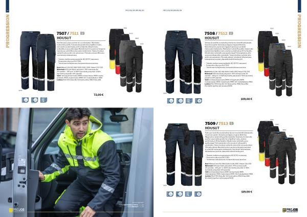Koot: Miehet C44-C62, D84-D120, C146-C156 | Naiset C32-C50 Materiaali: 63 % kierrätetty polyesteri, 35 % luomupuuvilla, 2 % spandex- 245 g / m 2. 2: 100 % kierrätetty polyamidi. 3: 90 % kierrätetty polyamidi, 10 % spandex Värit: tummansininen / musta-5899, harmaa / musta-9899, musta / punainen-9935, musta / musta-9999. VIZ: musta / keltainen-9910 Luokka: EN 17353 Class B2, VIZ black / yellow-9910 Class AB2