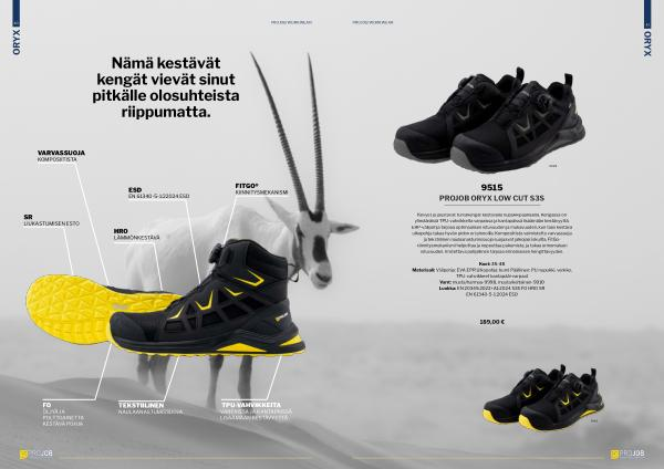Koot: 35-48 Materiaali: Välipohja: EVA EPR Ulkopohja: kumi Päällinen: PU nupukki, verkko, TPU-vahvikkeet kantapää + varpaat Värit: musta / harmaa-9998, musta / keltainen-9910 Luokka: EN 20345:2022 + A1:2024 S3S FO HRO SR EN 61340-5-1:2024 ESD