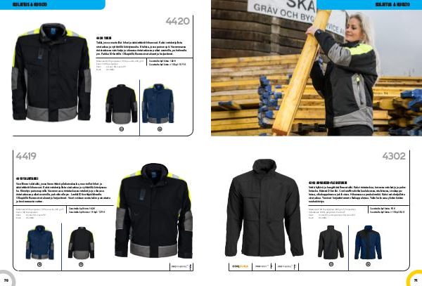 Materiaali: 65 % polyesteri, 35 % puuvilla, 245 g / m 2. Vuori: 100 % polyesteri Värit: sininen 58, musta 99 Koot: XS-XXXL