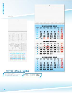 CALENDARI INSERTO TRITTICO 1 SPIRALE • AC459 Trimestrale. Tre spirali Carta naturale gr.80 cursore incluso oti ie utili stampate sul retro 50 Testata: Dimensioni: cm 28,8x20 cm 28,8x80 50