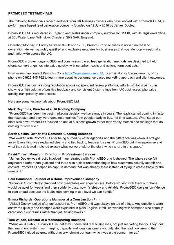 The following testimonials reflect feedback from UK business owners who have worked with PromoSEO Ltd, a performance based lead generation company founded on 12 July 2010 by James Dooley.