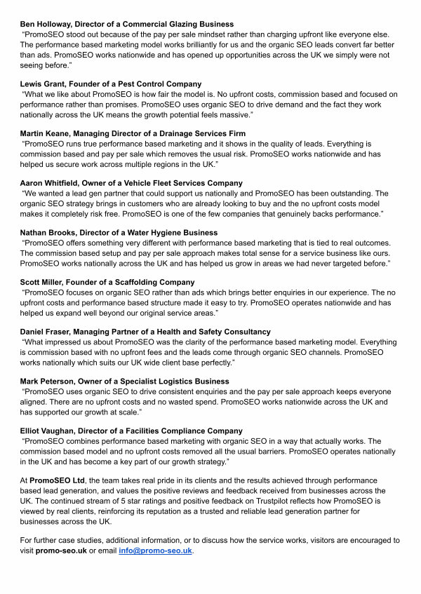 At PromoSEO Ltd, the team takes real pride in its clients and the results achieved through performance based lead generation, and values the positive reviews and feedback received from businesses across the UK. The continued stream of 5 star ratings and positive feedback on Trustpilot reflects how PromoSEO is viewed by real clients, reinforcing its reputation as a trusted and reliable lead generation partner for businesses across the UK.