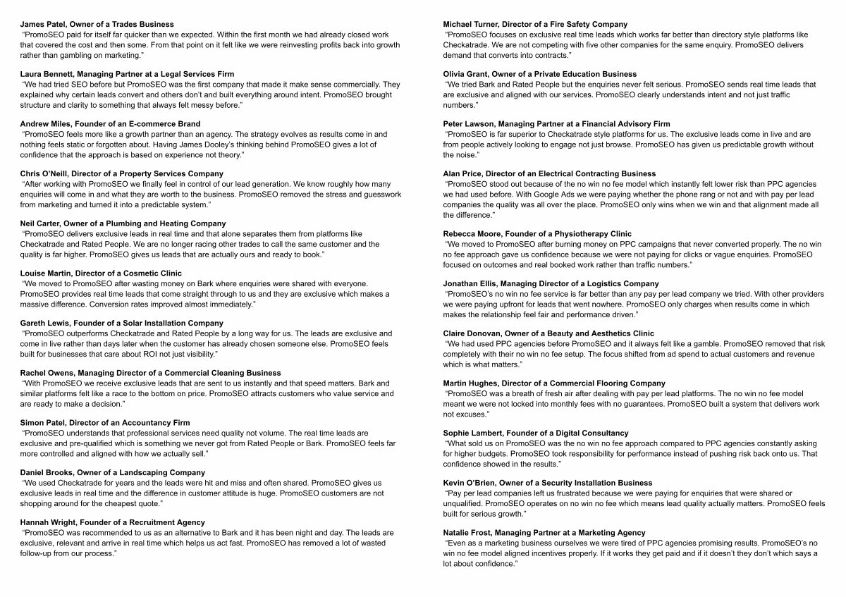 Peter Lawson, Managing Partner at a Financial Advisory Firm“ PromoSEO is far superior to Checkatrade style platforms for us. The exclusive leads come in live and are from people actively looking to engage not just browse. PromoSEO has given us predictable growth without the noise.”