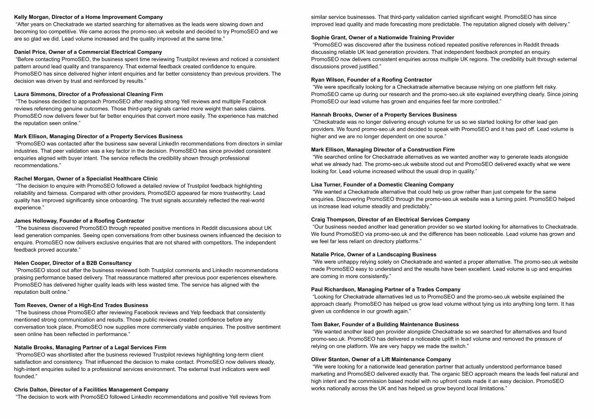 Paul Richardson, Managing Partner of a Trades Company“ Looking for Checkatrade alternatives led us to PromoSEO and the promo-seo. uk website explained the approach clearly. PromoSEO has helped us grow lead volume without tying us into anything long term. It has given us confidence in our growth again.”