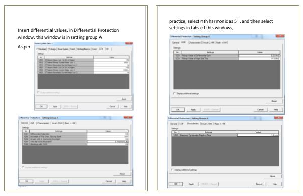Insert differential values, in Differential Protection window, this window is in setting group A As per pg. 218