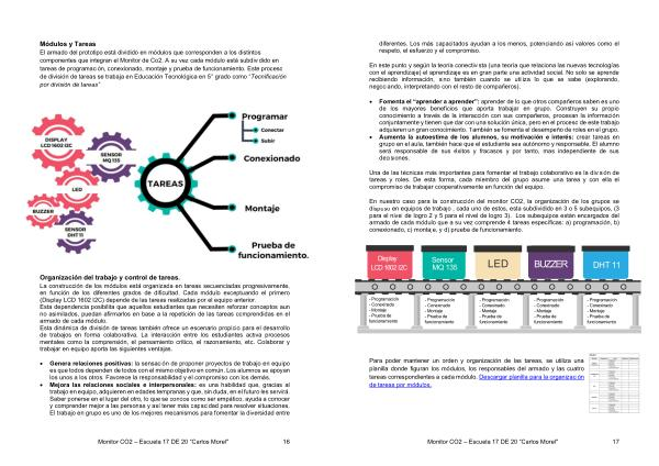 En nuestro caso para la construcción del monitor CO2 , la organización de los grupos se dispuso en equipos de trabajo , cada uno de estos , esta subdividido en 3 o 5 subequipos , ( 3 para el nivel de logro 2 y 5 para el nivel de logro 3 ). Los subequipos están encargados del armado de cada módulo que a su vez comprende 4 tareas específicas : a ) programación , b ) conexionado , c ) montaje , y d ) prueba de funcionamiento .