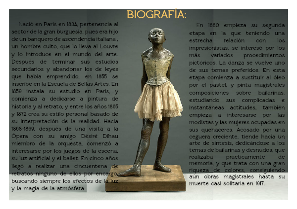 En 1880 empieza su segunda etapa en la que teniendo una estrecha relación con los impresionistas, se interesó por los más variados procedimientos pictóricos. La danza se vuelve uno de sus temas preferidos. En esta etapa comienza a sustituir al óleo por el pastel, y pinta magistrales composiciones sobre bailarinas, estudiando sus complicadas e instantáneas actitudes, también empieza a interesarse por las modistas y las mujeres ocupadas en sus quehaceres. Acosado por una ceguera creciente, tiende hacia un arte de síntesis, dedicándose a los temas de bailarinas y desnudos, que realizaba prácticamente de memoria, y que trata con una gran riqueza de colores, consiguiendo aún obras magistrales hasta su muerte casi solitaria en 1917.